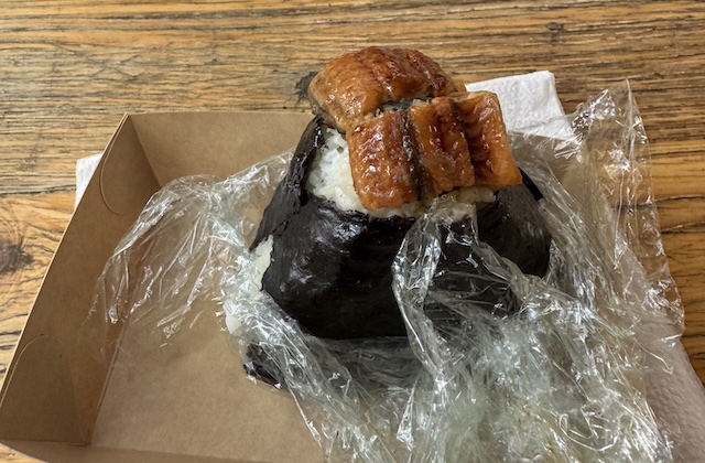 おにぎりの上にウナギ。中にもウナギ。ウナギの量は思ったより多くて味も懐かしいウナギの蒲焼の味で満足!