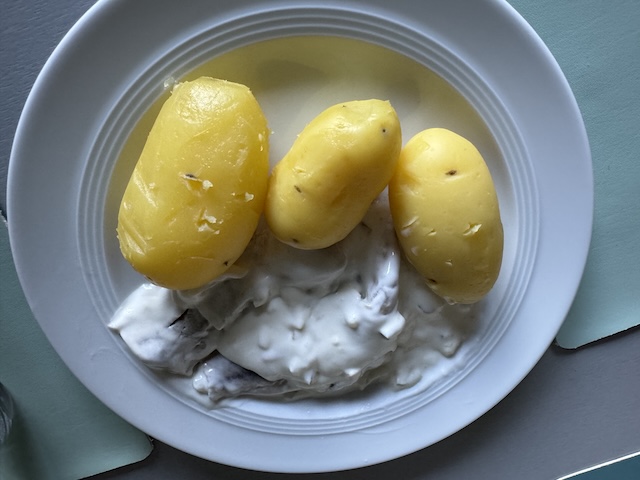 こちらも何度かこのブログに登場した「皮ごとゆでたじゃがいも、ニシンのクリームソース添え」です。
