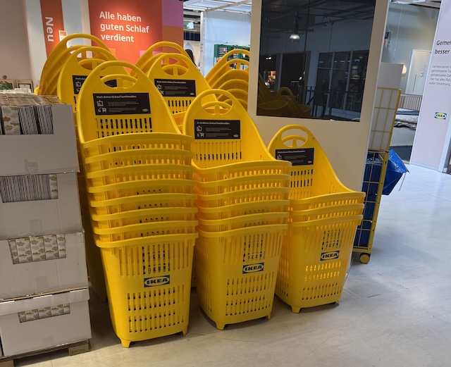 イケアは今まで黄色い袋か大きなカートだけでしたが、ここでもキャスター2個付きのカゴが登場。
