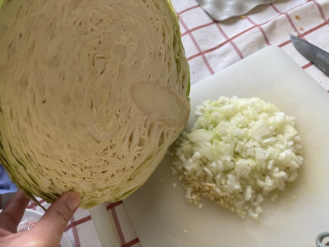 - 玉ねぎはみじん切り、キャベツは適当な大きさに切る