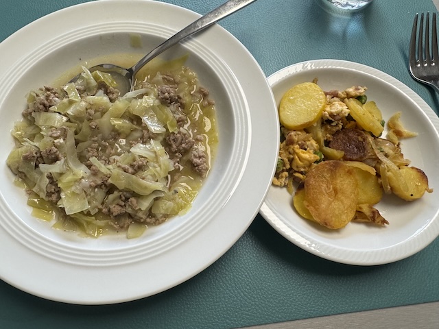 付け合わせは茹でたじゃがいもが定番だけど、この日はランチのジャーマンポテト(Bratkartoffeln)の残りがあったので、それと一緒に食べました。