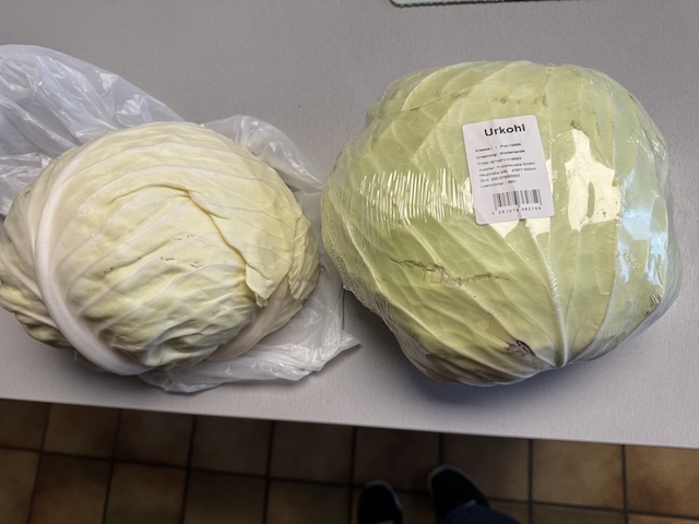 上から撮影しているからわかりにくいけれど、左が「収穫祭」でもらったドイツの普通のキャベツ(Weißkkohl)。右がその2日前にスーパーで安かったから買ったキャベツ(Urkohl)