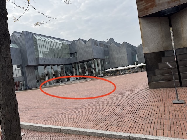 下の舞台でコンサートが行われている時にここを歩くと振動がホール内に伝わってしまうので、「歩くな!」と言う立て看板と見張っている人が数人います。柵はありません。