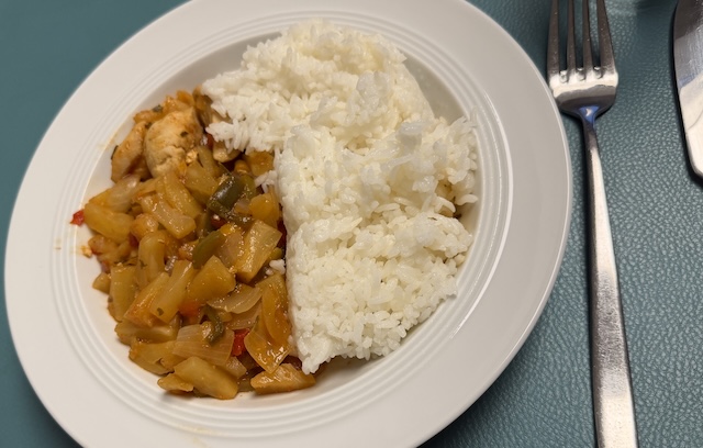 赤いパプリカと缶詰のパイナップルと鶏肉を炒めて、醤油やトマトピュレーで味付けて煮込む。ちょっと甘酸っぱい味の料理です。
