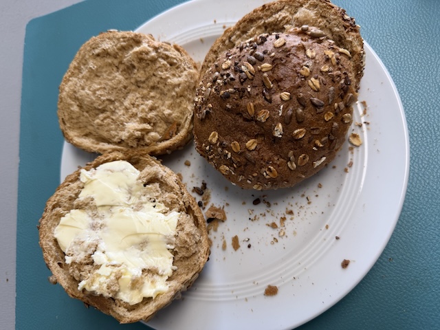 オーブンから出したばかりのパンは暖かくて、バターを塗って食べると美味しい!(写真のパンはバターが溶けていないけれど💦)